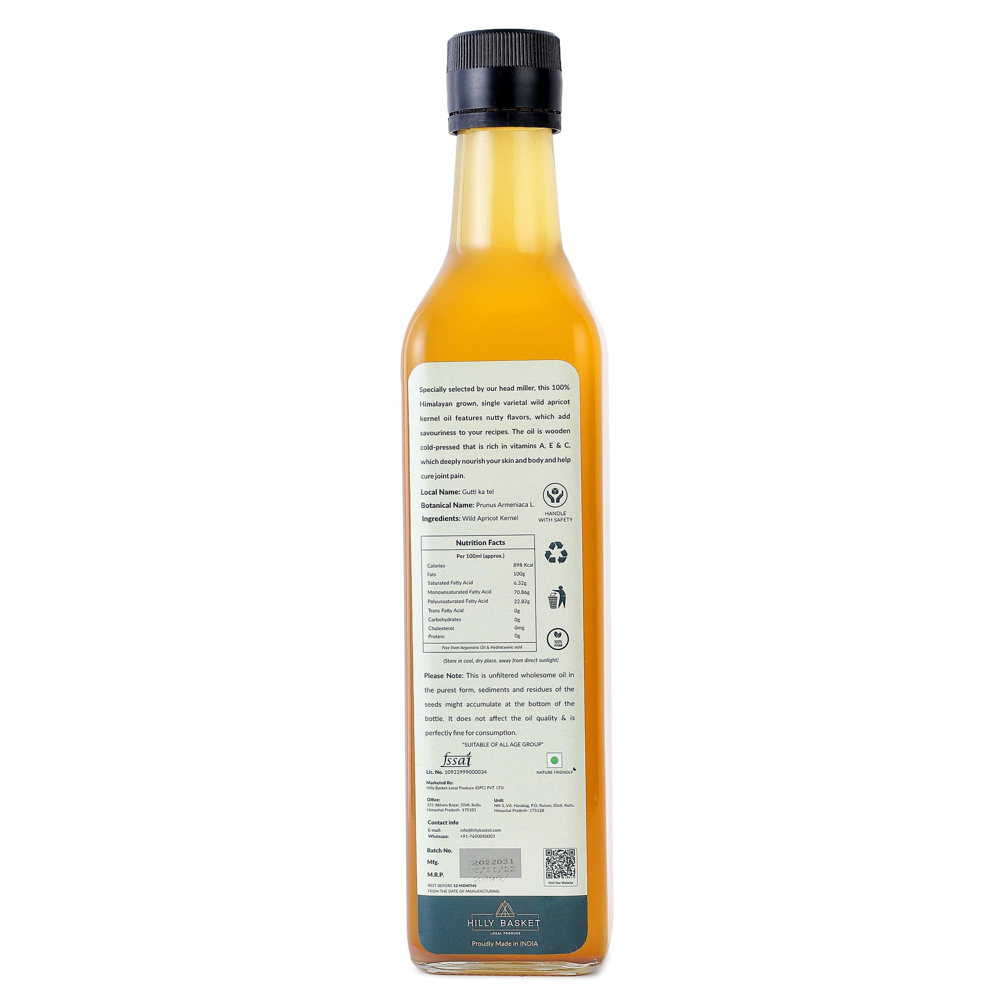 Specially selected by our head miller, this 100% Himalayan grown, single varietal wild apricot kernel oil features nutty flavors, which add savouriness to your recipes. The oil is wooden cold-pressed that is rich in vitamins A, E & C, which deeply nourish your skin and body and help cure joint pain.